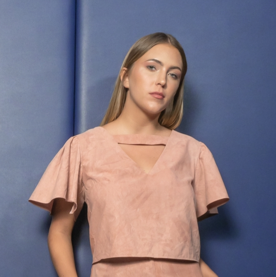 This LUZ blouse, is part of a set which can be purchased separately, consists of a loose blouse with short flared sleeves with ruffles. The blouse has a lovely «V» neckline in «cut-out» for chic style. It’s made in a flowing fabric that’s pleasant to wear. You’ll adore the V-neckline .