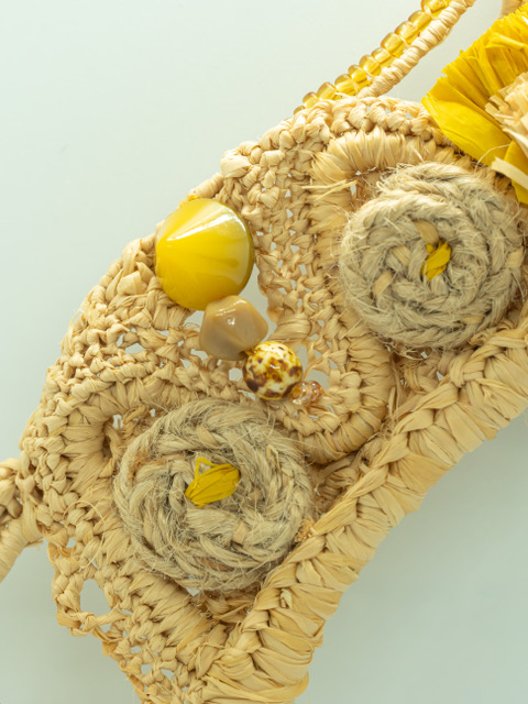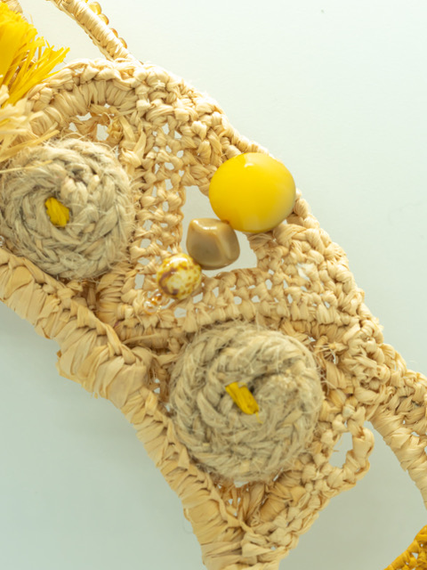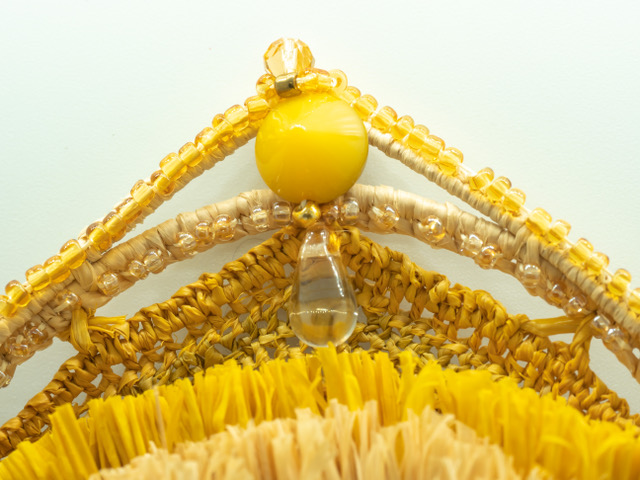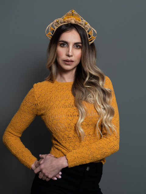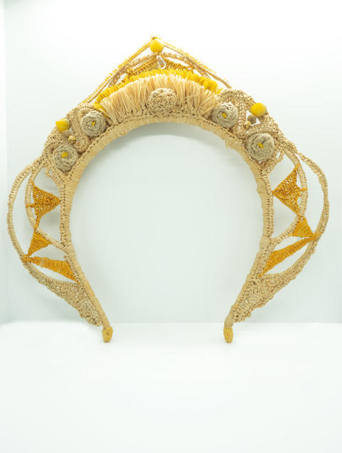 Es una combinación de  materiales rígidos, la suavidad de la raphia natural y tintada y multitud de detalles y variaciones de punto de tejidos, que tratan de transmitir el disfrute y creatividad del artesano como ofrenda para aquellas mujeres que quieran distinguirse, luciendo  diversidad y detalles originales.  Fiel a la identidad de la marca, incluye una pieza que tenga movimiento, impulsado por el movimiento de esa mujer especial que lo lleva.  En el caso de la DIADEMA HAYDEE, lo ubicaron  en la cima, en el punto más alto.